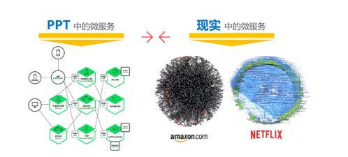 正如下图所示,PPT中的微服务总是美好的,但现实中的微服务却是一团糟糕,想甩甩不掉,越看越糟心。难道就没有办法了么?